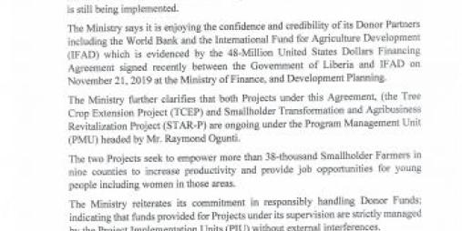 MOA Press Release -No Embargo On Donors' Funded Projects at the Ministry of Agriculture By Development Partners